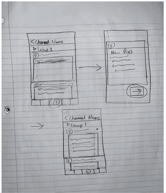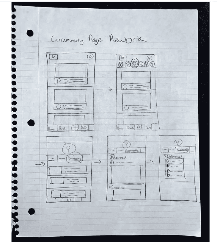 I created sketch ideations for the low fidelity prototype using paper sketches for rapid iterations. The community tab feature should encourage user interaction within their preferred channels. As such, the updated version includes:
