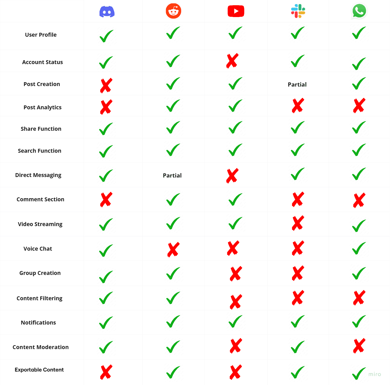 I used a feature comparison chart to further develop my insights from the app comparisons to the YouTube Community Tab. The feature comparison chart is a tool that allows us to compare notable app features between competitors. This method also helped me better understand the user's mental model with the app features